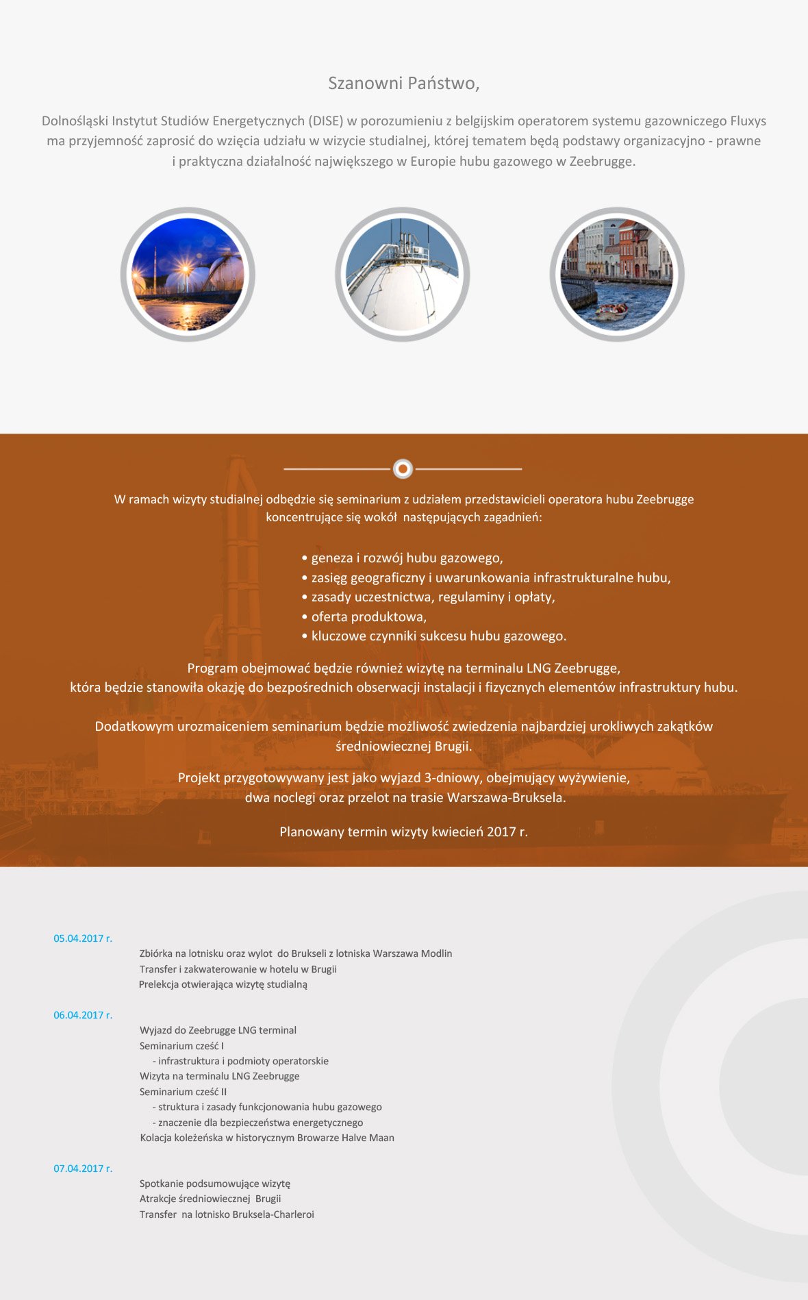 Dolnośląski Instytut Studiów Energetycznych (DISE) w porozumieniu z belgijskim operatorem terminalu gazowego Fluxys zorganizował w dniach 5-7 kwietnia wyjazd studyjny, którego tematem były podstawy organizacyjno-prawne i praktyczna działalność największego w Europie hubu gazowego – LNG Terminal w Zeebrugge.